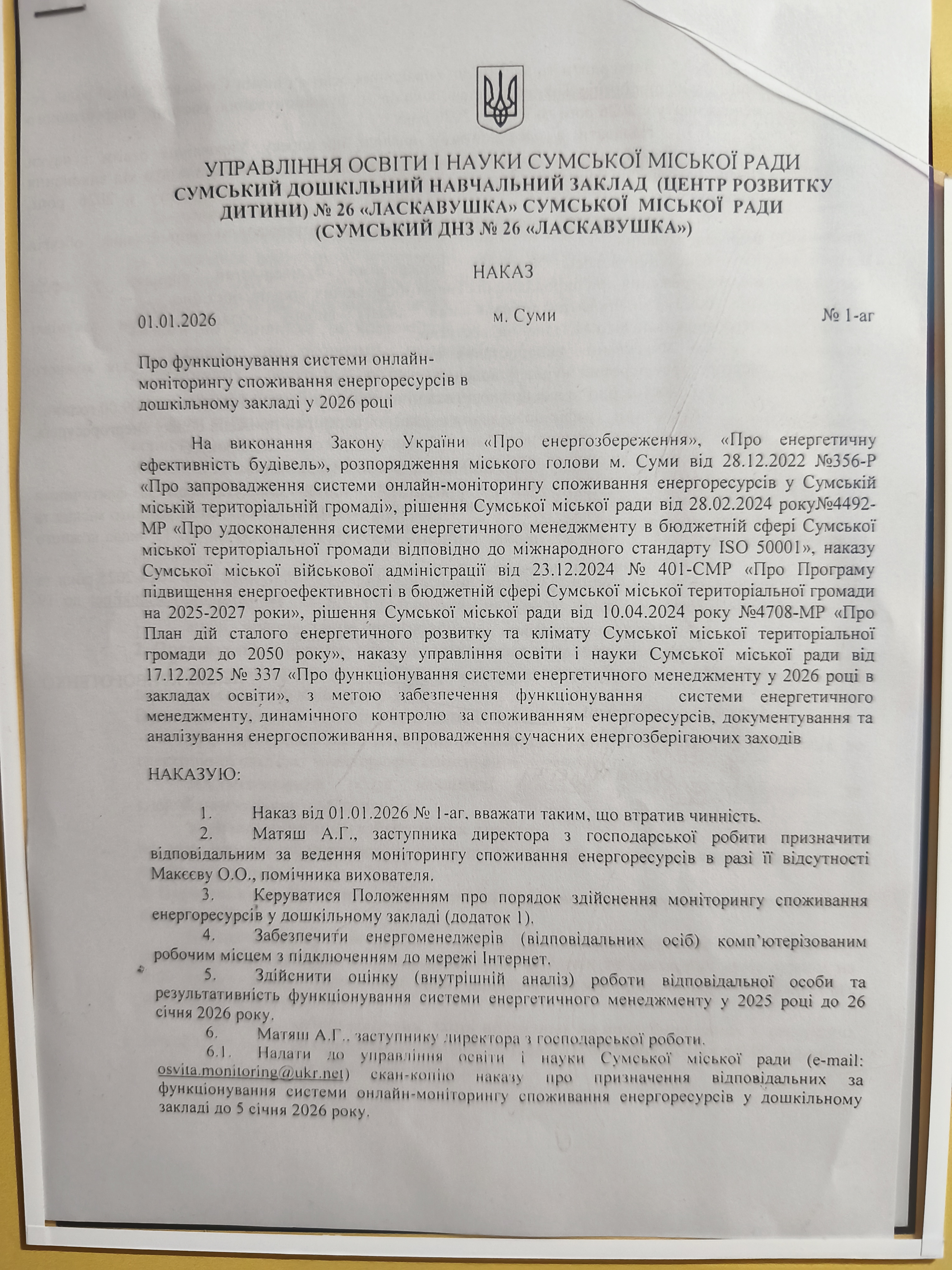 План заходів з енергозбереження в Сумському ДНЗ № 26 "Ласкавушка" на 2026 рік