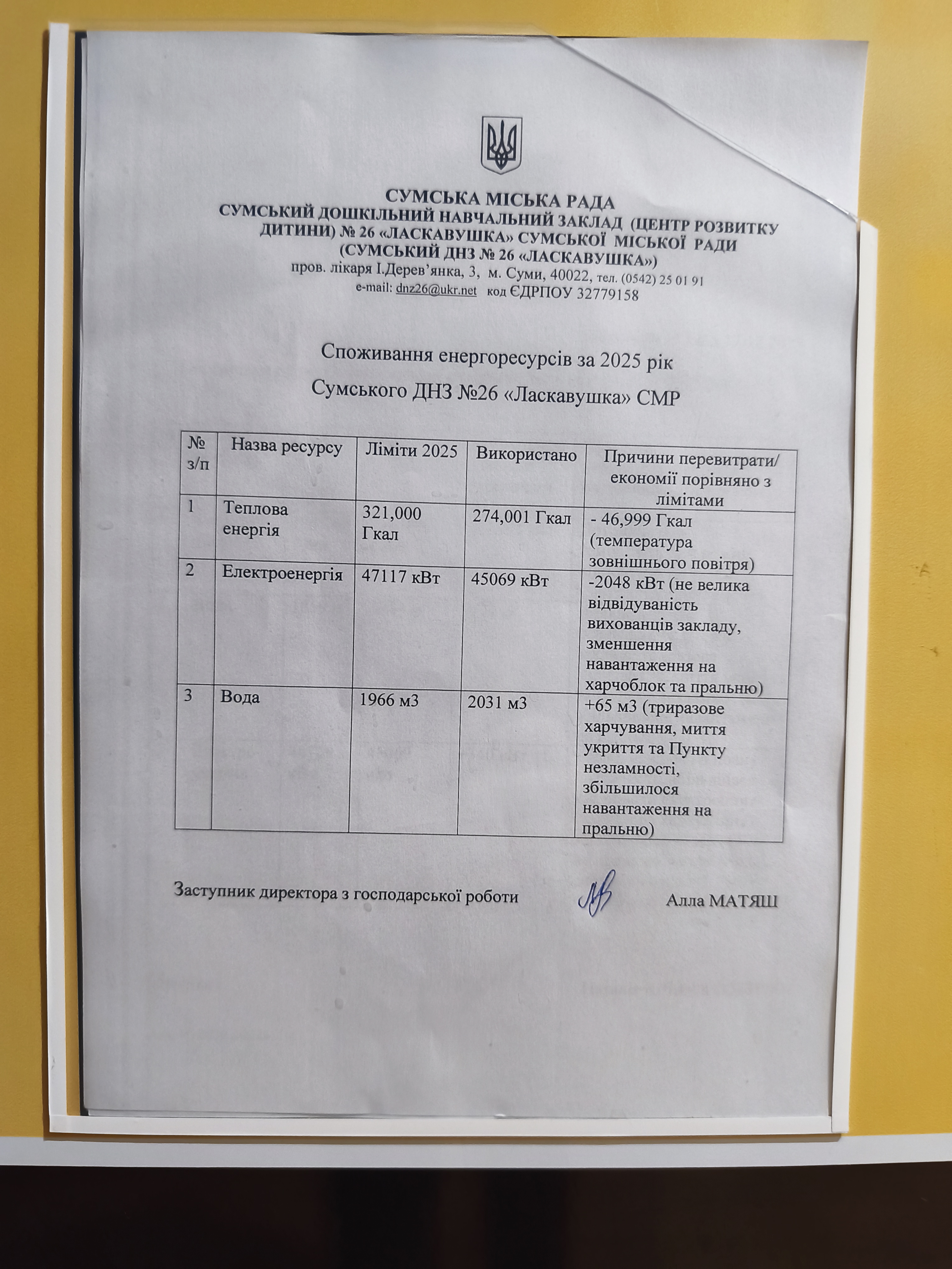 Звіт про виконання плану заходів з енергозбереження Сумського ДНЗ №26 "Ласкавушка" за 2025 рік